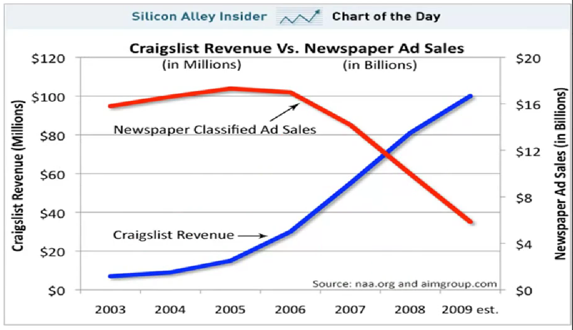 Lets take another example of newspaper ads business. Just within a decade, internet and online media destroyed newspaper ads business. In the example below, you will see that Craigslist with about 30 employees displaced multi-billion newspaper ads business and ~200K jobs were lost to the onslaught of internet and online advertising.