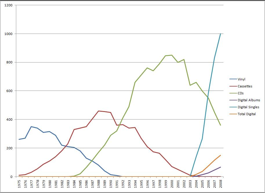 Let us take a look at this graph. This graph shows how over time Vinyl and Cassettes are displaced by Digital music (iTunes, YouTube, etc.), the decline/destruction of the former by the later. As an end customer, I am clearly better off with the lower cost of ownership, high fidelity in the quality of experience and ability to carry music with me. However for many businesses this means lost businesses, lost employment, obsolete stock / technology and ever shifting business models that need continuous investments.