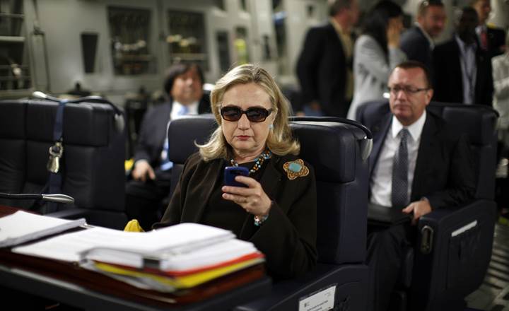 When I read the headline and saw the picture, as they say, thousand words came to my mind. Hillary is hiding some secret, may be it is some sort of conspiracy, she looks like an operating agent of a secret society, may be people around her are her secret agents. Look at the place, it looks shady. The red file on the desk is definitely a classified file that hides some secret information and soon the media will expose it.