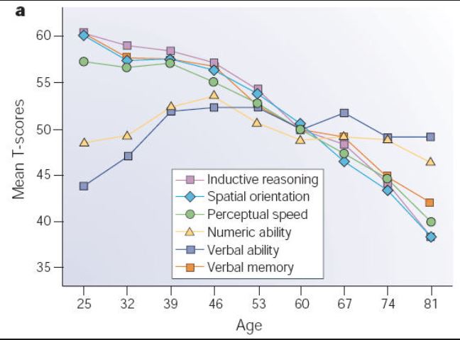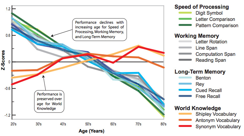 As you can see in the graph above, many of our cognitive abilities such as inductive reasoning, perceptual speed, verbal memory, etc. all start to decline after around 25 years of age. The only thing that increases and remains relatively stable over the years is verbal knowledge. This clearly explains the epidemic of management jargons, high-sounding political talk and bullshitting with no real content everywhere :).